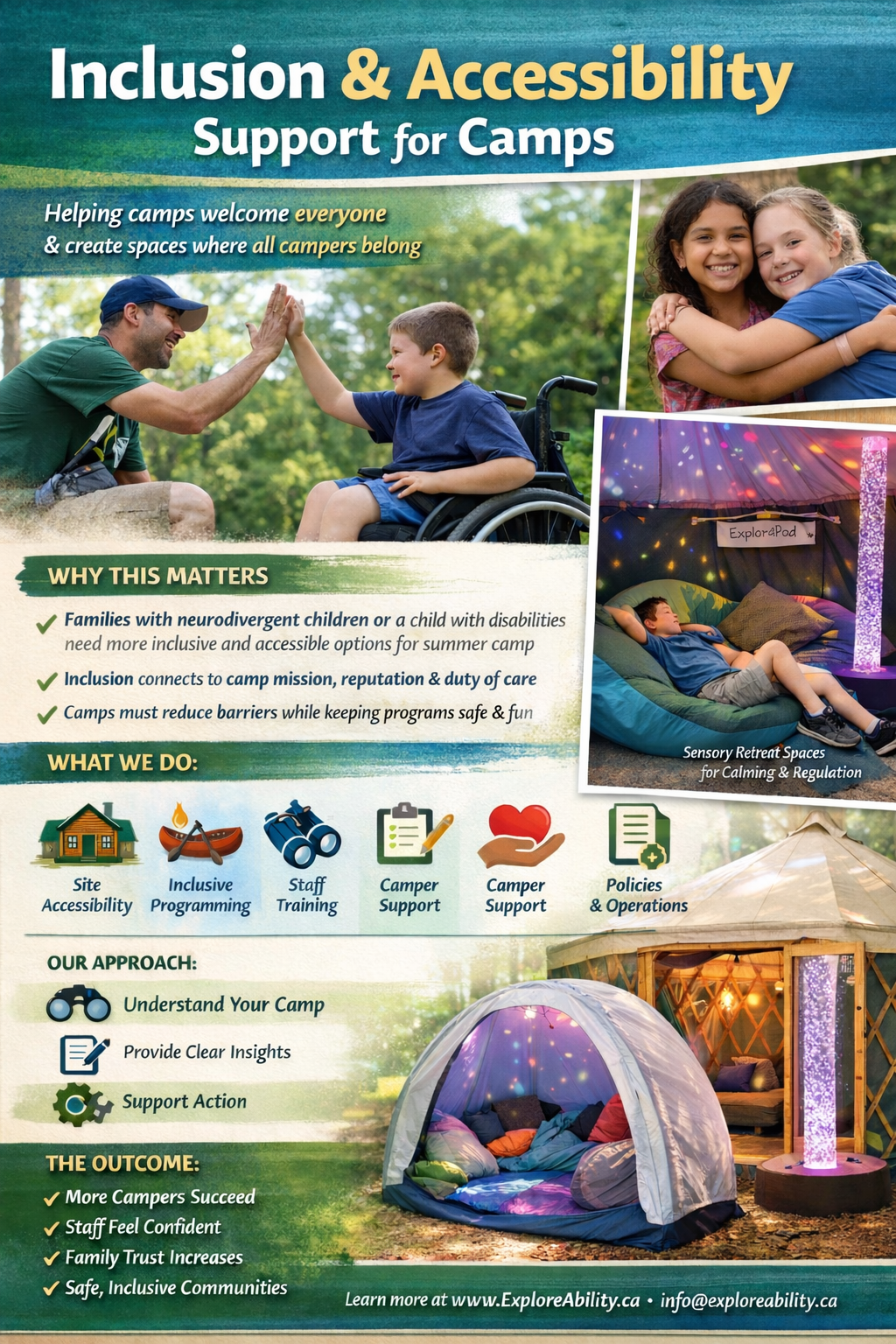 ExploreAbility uses the full breath and depth of their experience to create a truly unique inclusive and accessible camp for campers and staff. By combining our Adaptive Training Modules, Accessibility solutions, inclusion policies and procedures etc. we create a ‘Turn key’ solution to accommodate your camps needs.